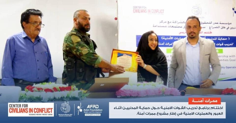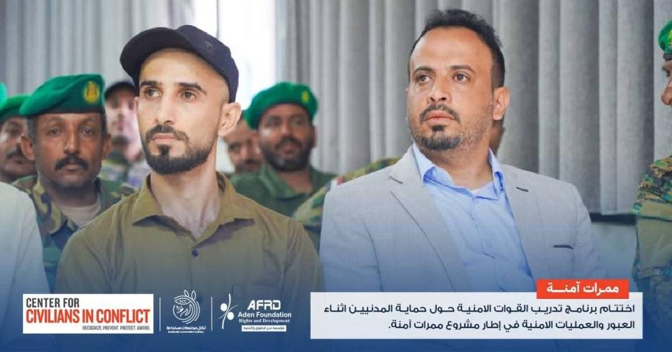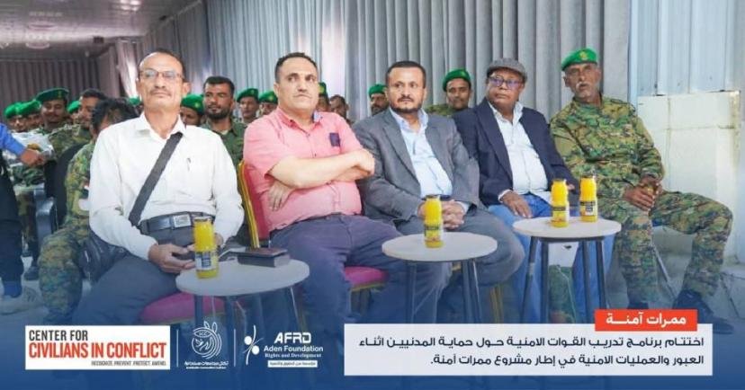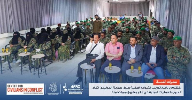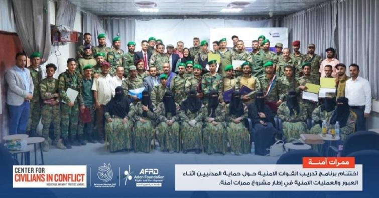 اختُتم البرنامج التدريبي الخاص بحماية المدنيين أثناء العبور والعمليات الأمنية، الذي نُفذ ضمن مشروع "ممرات آمنة" واستهدف (125) من ضباط وأفراد قوات الحزام الأمني، بما فيهم الشرطة النسائية، بتنفيذ مؤسسة عدن للحقوق والتنمية، بالشراكة مع مركز مدنيين في ظل الصراع (سيفيك) وتكتل مجتمعات مستدامة